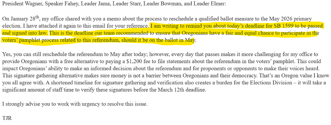 Read emails that failure to meet the February 25 deadline imperils Oregonians’ “fair and equal” access to the voters pamphlet associated with the referendum vote.