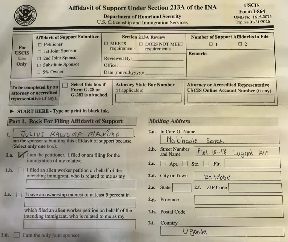 Maximo listed his employers, including Uplifting Journey, on the form. It is unknown what relation Nabbaale is to Maximo, and whether Maximo ever submitted an affidavit of support for her.