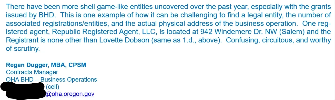 On May 27, 2025, an Oregon Health Authority contracts manager alerted other senior OHA officials about a constellation of businesses related to and including Uplifting Journey, calling them “shell game-like entities” he found “confusing, circuitous and worthy of scrutiny,” according to emails obtained exclusively by Oregon Roundup Foundation.