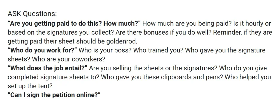 Questions SEIU 503 urges members to ask gas tax signature gatherers in a Google form obtained by Oregon Roundup Foundation.